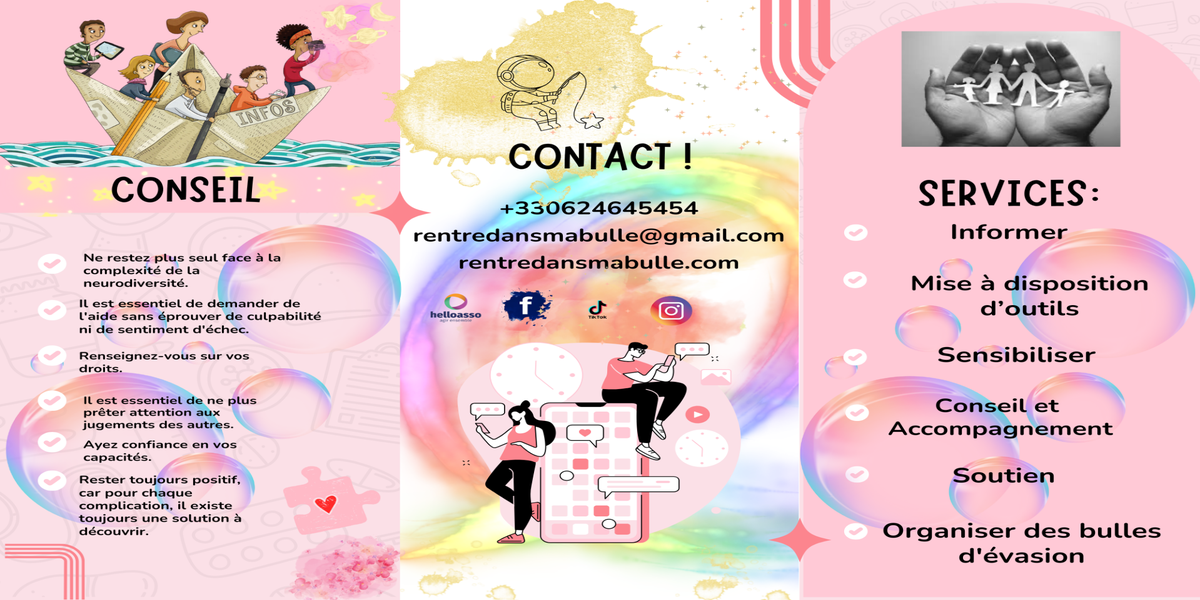 Notre galerie est une vitrine vivante de la diversité et de la richesse des expériences que nous offrons à travers 'Rentre dans ma bulle'. Vous y découvrirez des photos et vidéos capturant l’essence de nos ateliers de développement personnel, où les participants explorent des techniques variées pour mieux se comprendre et grandir. Nous mettons également en lumière les accompagnements individuels, témoins de moments précieux de connexion et de progression personnelle. En parallèle, nos sessions de sensibilisation et de formation sont illustrées pour refléter notre engagement à éduquer et à sensibiliser sur la neurodiversité. Chaque image raconte une histoire, celle d’une démarche profondément humaine et inclusive, où chacun trouve sa place dans un environnement bienveillant. Nous espérons que cette galerie saura vous transmettre l’énergie, la passion et le soin que nous investissons dans chacune de nos activités.
