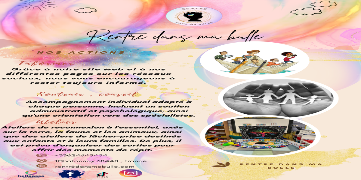 Découvrez les moments forts et les activités de notre association, 'Rentre dans ma bulle', située à CHATONNAY. Cette galerie vous offre un aperçu des divers ateliers de développement personnel, des accompagnements individuels, et des sessions de sensibilisation et de formation que nous organisons.